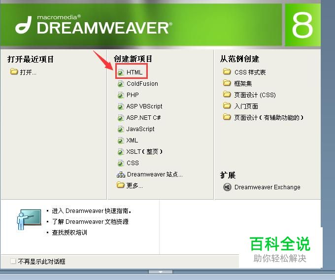首先打开DW,点击创建新项目的HTML。如下图所示。