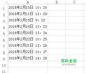 以下图中的数据为例演示操作方法。可以看到这些数据是由日期与时间组成的,日期与时间之间由一个空格分隔。