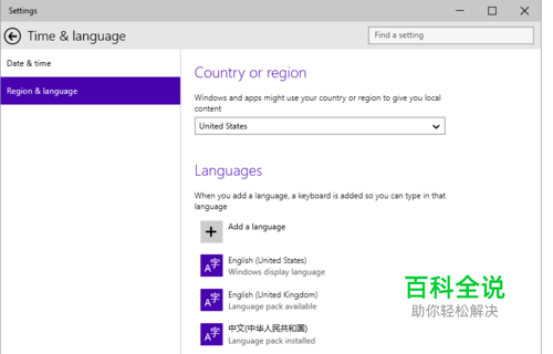首先,由于小娜目前不支持中国地区,我们要做的就是改区。 打开settings->时间和语言->区域和语言 (这里说明一下,我的电脑已经设置好了,但鄙人比较懒,不想重新设置,以下图片展示的是英语版本的,请多担待)