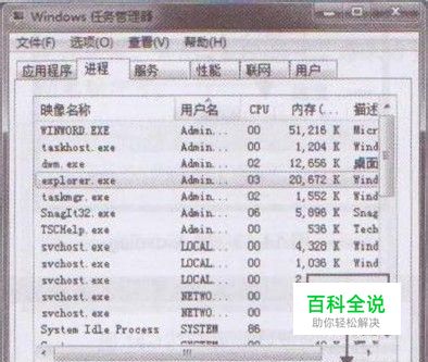 1、按Ctrl+Alt+Delete组合键,弹出“Windows任务管理器”对话框,切换到“进程”选项卡,选择explorer.exe进程,并单击“结束进程”按钮,如图1所示