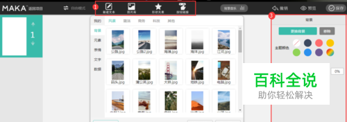 5.元素编辑 1、MAKA编辑器的元素包括背景、文本、图片、形状、按钮和图标。2、点击现有元素,编辑器右侧会出现该元素的编辑选项,你可以把它变成你想要的样子。3、点击编辑器上方的各元素按钮可新增元素。
