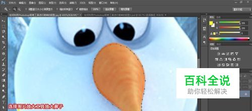 点击左侧图片放大工具放大雪人胡萝卜鼻子,利用 钢笔工具描出鼻子轮廓。
