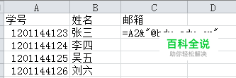 然后在邮箱列(如图C2空白格)输入 =A2&"@bdu.edu.cn",这里要注意输入的双引号,必须是半角的双引号噢,可以通过Ctrl+空格键切换,否则会显示公式错误而无法执行。