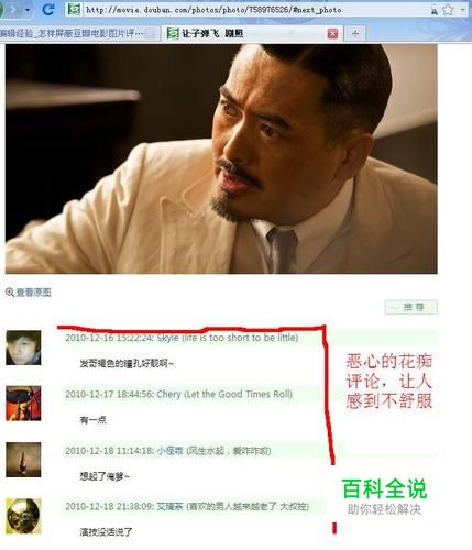 豆瓣电影上的剧照可以查看大图,非常实用,但总有一些网友的花痴评论让人心烦,怎么去掉它们?