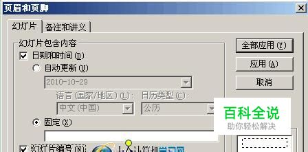 在“幻灯片编号”的前面打上一个√勾。然后,点击“全部应用”。 现在,我们就借助了幻灯片的编号设置成为当前页的页码了,如下图。
