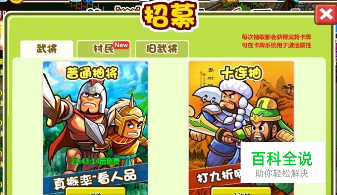 一个小小的村长如果想打天下,那就必须要有足够的野心和实力,在村长打天下网页游戏里每一个村长要想征服天下各国或是其他村长,就必须进行武将招募来提升实力,小编这有一份祖传的村长打天下武将招募攻略供各位村长们参考。 在村长打天下游戏界面下方,点击“招募”即可进入到招募界面,选择“武将”一栏就能看到当前可招募的武将了,当然了武将并不是那么容易招募的,首先你需要有相关的牌激活武将,然后才能进行招募。一般步骤为村长先在钱庄里购买获得武将卡牌,其后才能在招募界面招募。 同时村长打天下里还有非一般步骤可获得武将卡牌,点击游戏界面的“宝殿”图标可进入到宝殿界面,这里分别有钻石宝殿、蓝玉宝殿、联盟宝殿、将魂宝殿。所有宝殿都会定时刷新,很大机率会有强大的武将卡牌被刷新出来,购买后同样会激活相应的武将,随后可以在招募界面里进行招募。 另外不同的宝殿里所兑换所需要的物品是不同,例如钻石宝殿只能使用钻石兑换,蓝玉宝殿则只能使用蓝玉牌进行兑换。同时温馨提醒:每一个武将只能获得一个,相同的武将卡牌可以在卡牌收集界面的“背包”一栏里分解获得将魂,将魂可在将魂宝殿兑换到其他的武将卡牌哟!