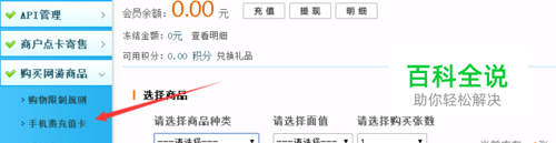 在购买左边一栏点击购买网游商品,这里可以选择购买话费充值卡或者话费直充。