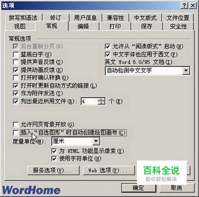 第2步,在打开的“选项”对话框中切换到“常规”选项卡,取消“插入‘自选图形’时自动创建绘图画布”复选框,并单击“确定”按钮。