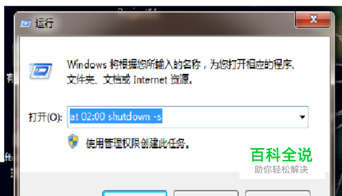 如果你想让电脑在夜里2点整关机,就输入at空格02:00空格shutdown空格-s 注意一定要有空格,如果你想让电脑在其他时间关机,只需改变时间即可。