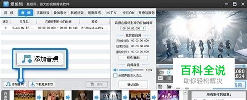 添加视频和动感音乐 首先,我们点击“添加视频”按钮,将拍摄的鬼步舞视频导入爱剪辑。接着,切换到“音频”面板,点击“添加音频”按钮,即可为视频一键导入动感十足的音乐。