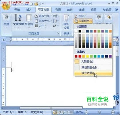 第1步,打开Word2007文档窗口,切换到“页面布局”选项卡。在“页面背景”分组中单击“页面颜色”按钮,并在打开的页面颜色面板中选择“填充效果”命令,如图所示。