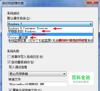 在图中的下拉菜单中选中你想默认进入的系统。注意不要选择还原系统或者蓝屏修复的选项。选择好了以后点击确定