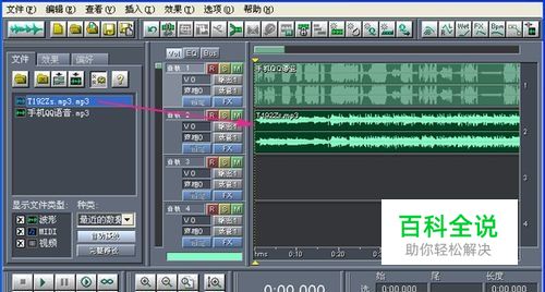 刚才选中第二个手机QQ语音.mp3再点击上面的“插入多轨中”按钮图,右边框框里面就出现了淡绿淡绿似音轨条波形。