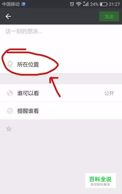 1.首先要登录自己的微信账号,登陆后点击窗口,然后发一条朋友圈,点击所在位置,如图 :