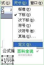 选中双击了以后,公式编辑器就会进入到修改编辑状态,这个时候,我们可以看到,word窗口的菜单变了。现在,如上图一样,执行菜单操作:“尺寸”→“定义”。 弹出如下图的对话框!