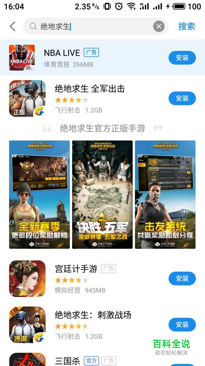 进入手机应用市场界面,在搜索中输入“绝地求生”进行搜索。