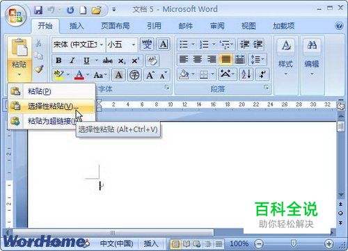 第2步,打开Word2007文档窗口,在“开始”功能区的“剪贴板”分组中单击“粘贴”下拉三角按钮,并在打开的菜单中选择“选择性粘贴”命令,如图2009021416所示。图2009021416 选择“选择性粘贴”命令