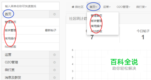 2.点击管理社区,进入微社区管理后台,注意看下图,篮圈内是父菜单,红圈内是子菜单。