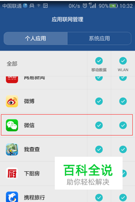 5. 确认微信的联网权限: 设置 > 流量管理 > 应用联网管理,找到微信,然后把微信的移动数据和wlan选项,重新进行勾选: