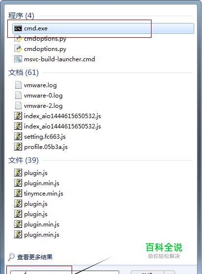 打开CMD命令行:打开桌面菜单→搜索程序框输入CMD→点击cmd.exe