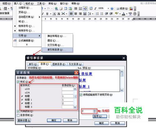 设置好大纲级别后,就可以进行目录的生成了,首先将光标移动到长文档的最前面,然后点击插入—引用—索引和目录,弹出索引和目录窗口,点击目录选项卡,选择合适的显示级别,这儿选择2,则目录只包括1级和2级标题,以此类推。 确定,即可自动生成目录了。 生成的目录也可以进行字体和段落的样式修改,直接右击任何一个一级标题进行样式修改,然后即可应用于所有的一级标题,右击任何一个二级标题,然后修改样式即可应用于所有的二级标题。 具体如图所示: