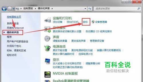要调节鼠标指针大小我们需要打开鼠标的属性设置窗口,可以通过电脑控制面板中的硬件和声音下的鼠标图标点击进入。