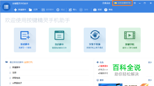 在按键精灵手机助手首页点击"新建脚本"按钮新建一个脚本。