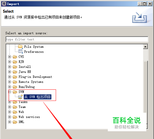 在上图中填写好项目在SVN服务器上的地址即可,在点击下一步,进入到选择项目的界面,选择好项目后接下来的3步都可以直接默认。如下图,
