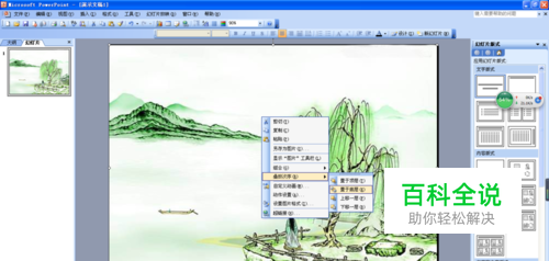 打开要插入诗朗诵的ppt,插入一幅与诗歌相配的背景图片。比如,我要插入的是《咏柳》,就找到一张有关柳树的图片粘贴到ppt中,点击鼠标右键,选择“叠放次序”-“置于底层”。