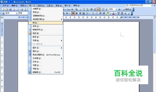 在插入的下拉菜单中选择“域”,如图所示。
