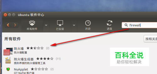 我们安装玩ubuntu后系统中是无防火墙的 我们打开“ubuntu软件中心”,然后在搜索框中输入“firewall”