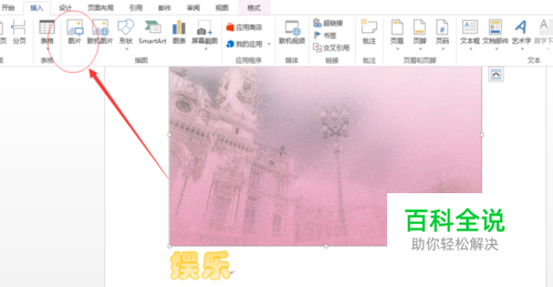 点击页面任何位置,点击”插入“选项卡的”图片“。插入背景图片。