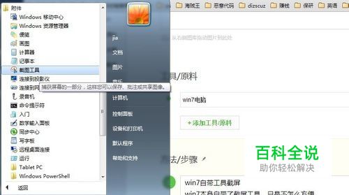 win7自带工具截屏 win7本身自带了截屏工具,只是不怎么方便 在开始,附件中