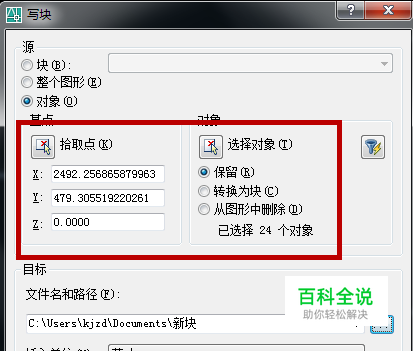 此时在画图区会弹出一个写块的编辑设置页面,在写块的编辑设置页面我们先点击下方的【对象】选项然后框选整个图形,再点击【拾取点】选项在CAD图形上找一点当做拾取点。