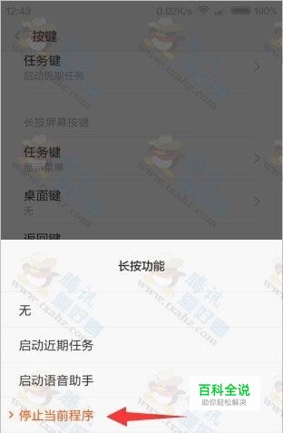 设置 - 更多设置 - 按键 - 返回键,设置为停止当前程序