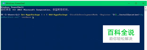 2、进入后,复制下面的命令 Get-AppxPackage | % { Add-AppxPackage -DisableDevelopmentMode -Register "$($_.InstallLocation)\AppxManifest.xml" -verbose } 粘贴到输入行,再按键盘上的 回车键(Enter)运行修复即可,如图。