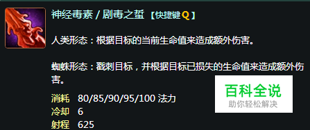 神经毒素 / 剧毒之蜇 【Q技能】 人类形态:根据目标的当前生命值来造成额外伤害。 蜘蛛形态:戳刺目标,并根据目标已损失的生命值来造成额外伤害。 消耗 80/85/90/95/100 法力 冷却 6 射程 625 效果 造成相当于40/75/110/145/180加上目标4(+3% 法术强度)%当前生命值的魔法伤害。对野怪的最大伤害:75/100/125/150/175。