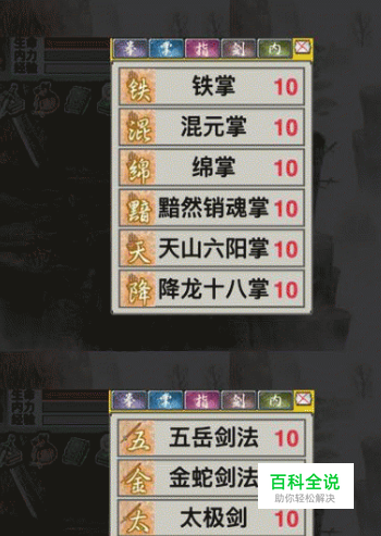 注意:散人第一章学习基本内功、招架、一气功到50级,基本拳法30级,基本轻功40级,剑法、刀法,推荐后者50级。这样基本能打到隐藏门派所在章节。