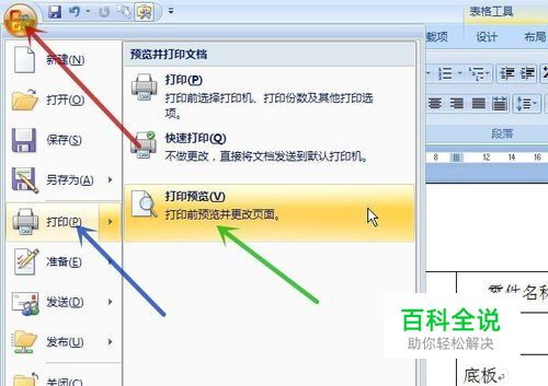 点击左上角的 (Office 按钮) (图中红色箭头所指),将鼠标指针移至 (打印) (图中蓝色箭头所指),在弹出菜单中点击 (打印预览) (图中绿色箭头所指)