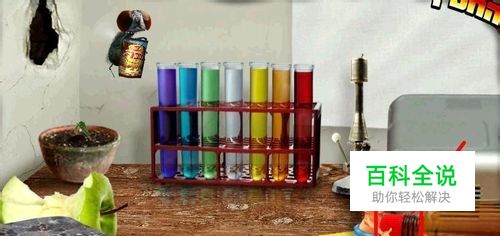 点击瓶盖,拿起瓶盖,然后依次点击后面的三个试管,要点击的试管,我已经给你圈出来了:这三种溶液混合起来,然后点击试管左边的花盆,你会看到花开了。