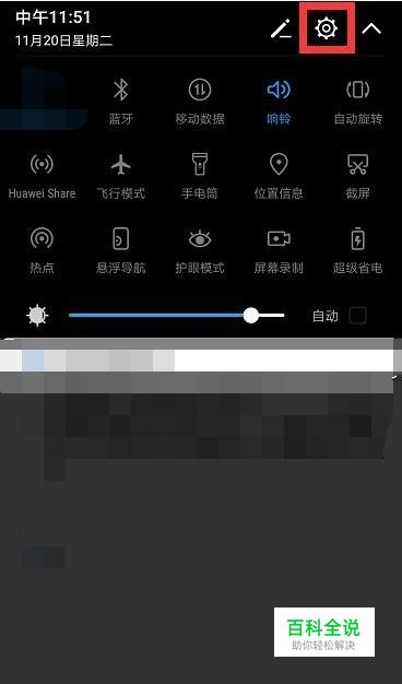 手机屏幕顶部手指往下轻滑,弹出窗口,点击齿轮【设置】。