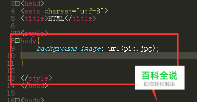 在body中创建背景图片,就需要用到背景图片属性啦,如图在background-image后面插入url;在rul后面就是添加的图片链接位置