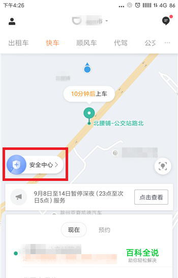 设定好紧急联系人后打开滴滴出行,在首页中可以看到有【安全中心】的选项,点击这个选项。