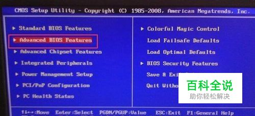 1、依据主板状况不一样,看电脑开机提示bios按键快捷键进入bios界面。在bios界面中挑选“advanced bios features”选项按回车进入高级选项,如图: