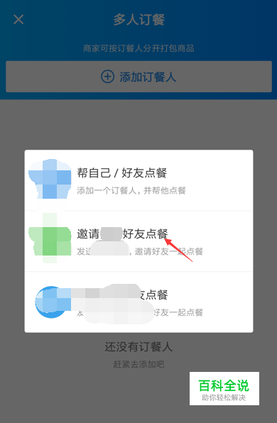 进入多人点餐的页面,点击添加订餐人,在弹出的对话框中选择一种方式,如可以邀请好友一起点餐。