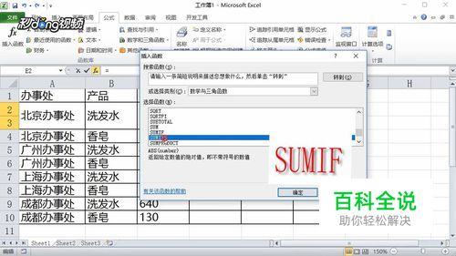 弹出公式窗口,在或选择类别的下拉窗口中选择“数学与三角函数”,在其下的选择函数窗口中选择“SUMIF”,点击“确定”。