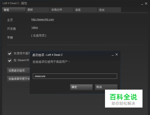 正版方法:首先打开Steam》找到“库”》游戏》“Left 4 Dead 2”。 然后右键“Left 4 Dead 2”,选择“属性”,找到“常规”》设置启动项,添加-insecure。