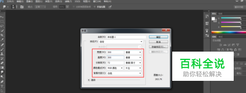 打开运行PHOTOSHOP软件,点击文件-新建命令来建立一个文档,在弹出的对话框中设置大小为300*300像素,分辨率72即可。