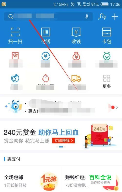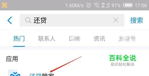 打开支付宝。如图在首页上方输入框输入“还贷管家”,点击如图第一个搜索结果。