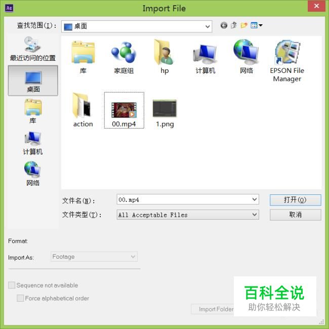 在该界面内按下快捷键Ctrl+I键,弹出导入文件对话框,在该对话内找到我们的视频文件,如图所示: